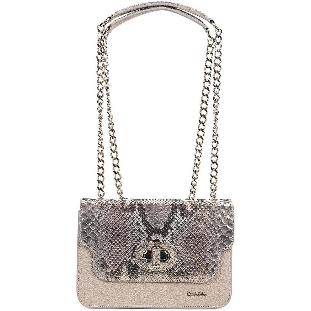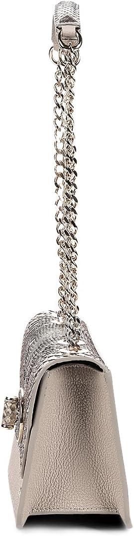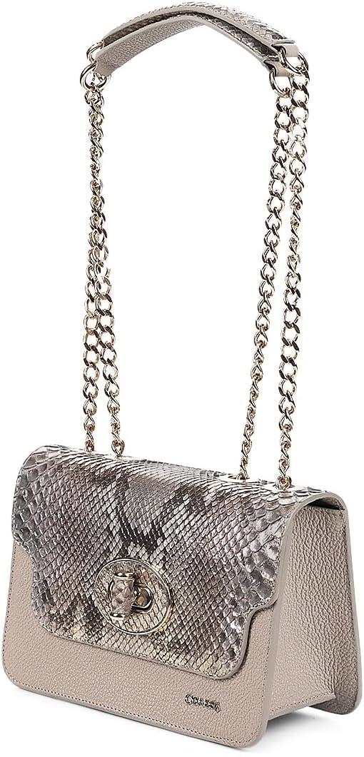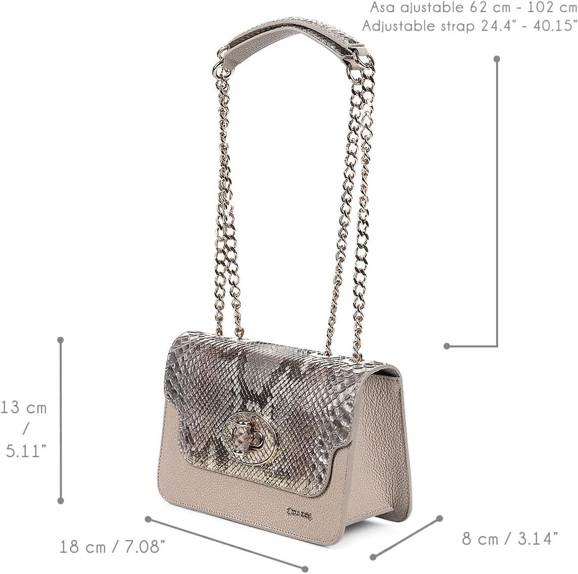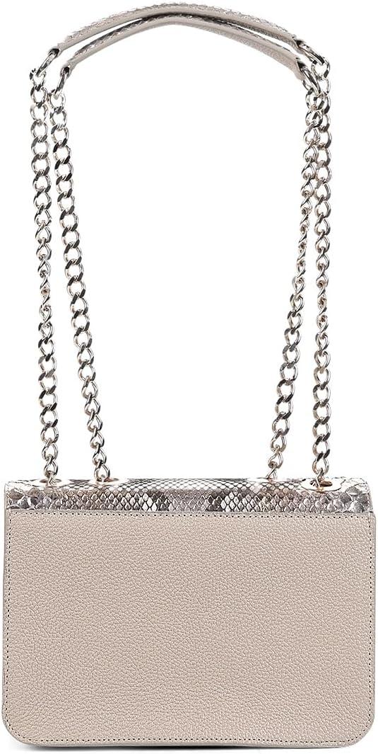 Women's crossbody bag, handcrafted in genuine python leather and bovine leather. The front features a platinum-finished python leather panel, adding a touch of shine and texture. Secured with a metallic clasp and magnets, this compact yet elegant piece includes a built-in cardholder with space for three cards. The adjustable chain strap allows for comfortable crossbody or shoulder wear. A refined fusion of luxury, practicality, and modern elegance.