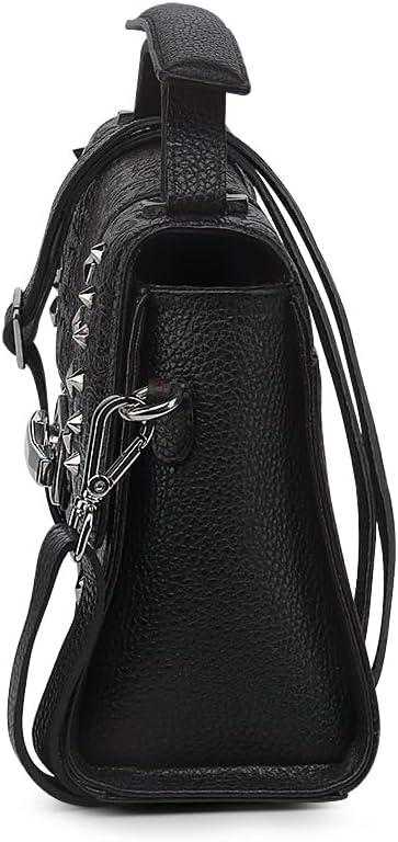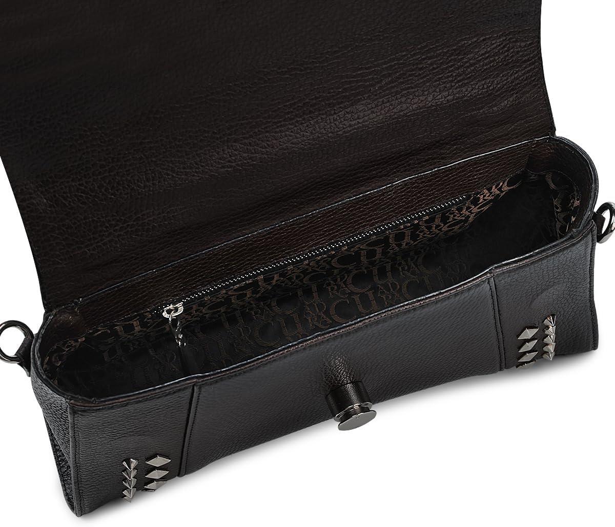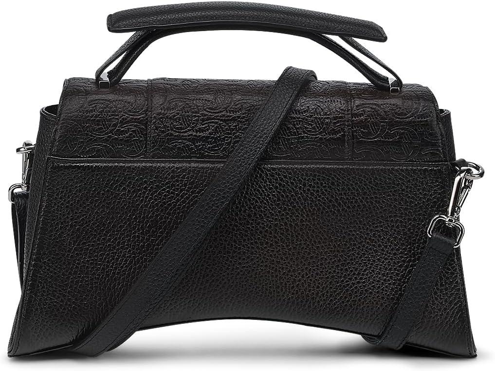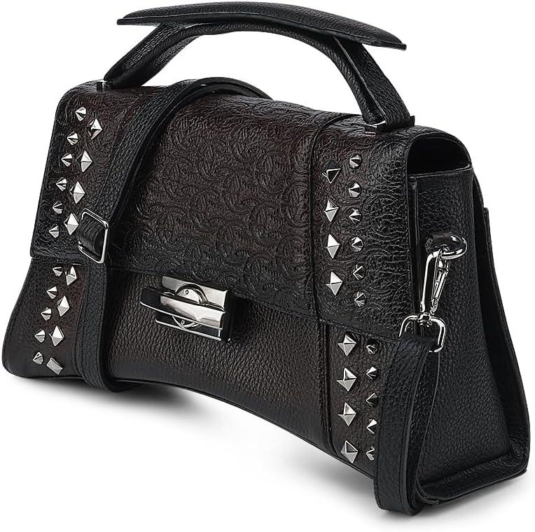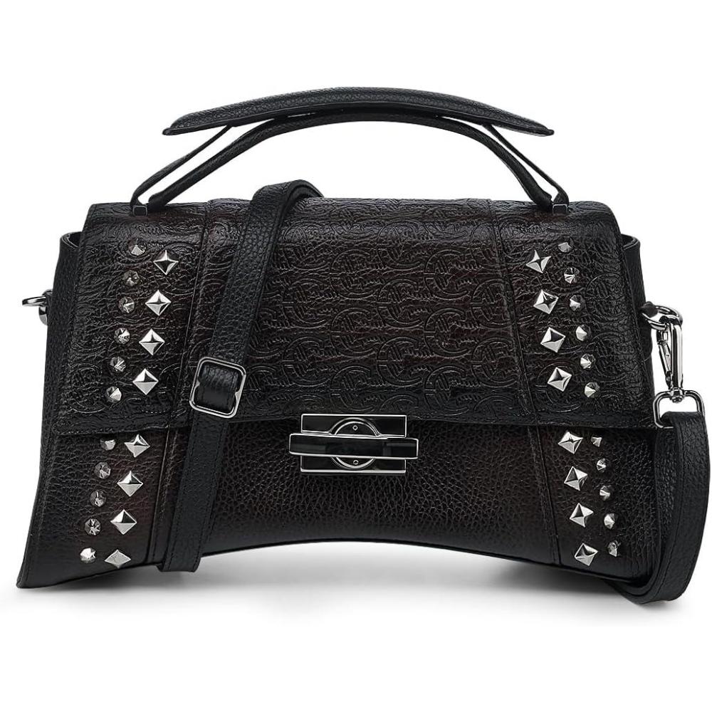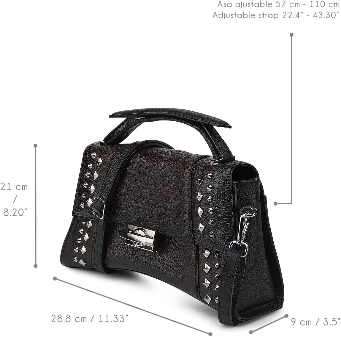Hand bag for women in genuine leather. Designed for modern elegance and daily functionality, it features an embossed monogram plate at the front, accentuated with metallic studs that add a bold yet refined edge. The spacious interior includes a secure zip pocket for essentials, while the exterior back compartment offers quick-access storage. With both a short handle and a long, adjustable, removable strap, this versatile piece can be carried by hand or worn over the shoulder. Secured with a front metal clasp and hidden magnetic closures, it’s the perfect balance between security and effortless style.