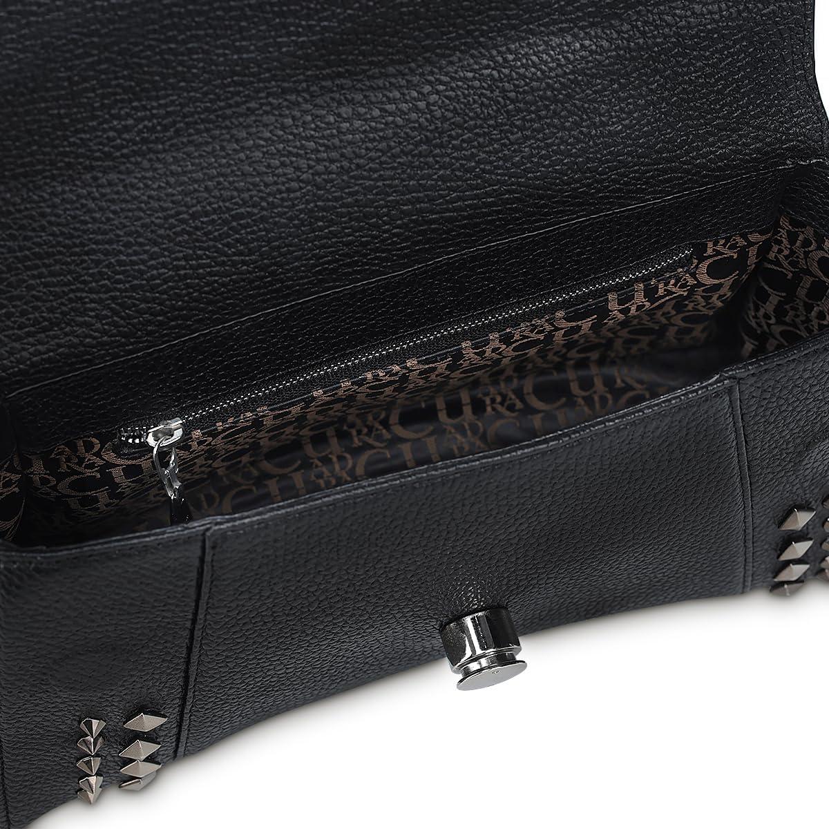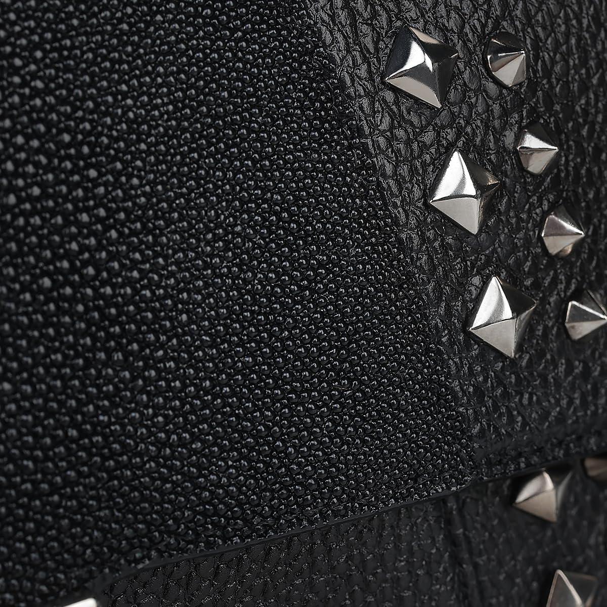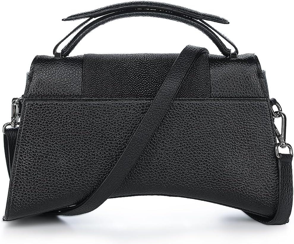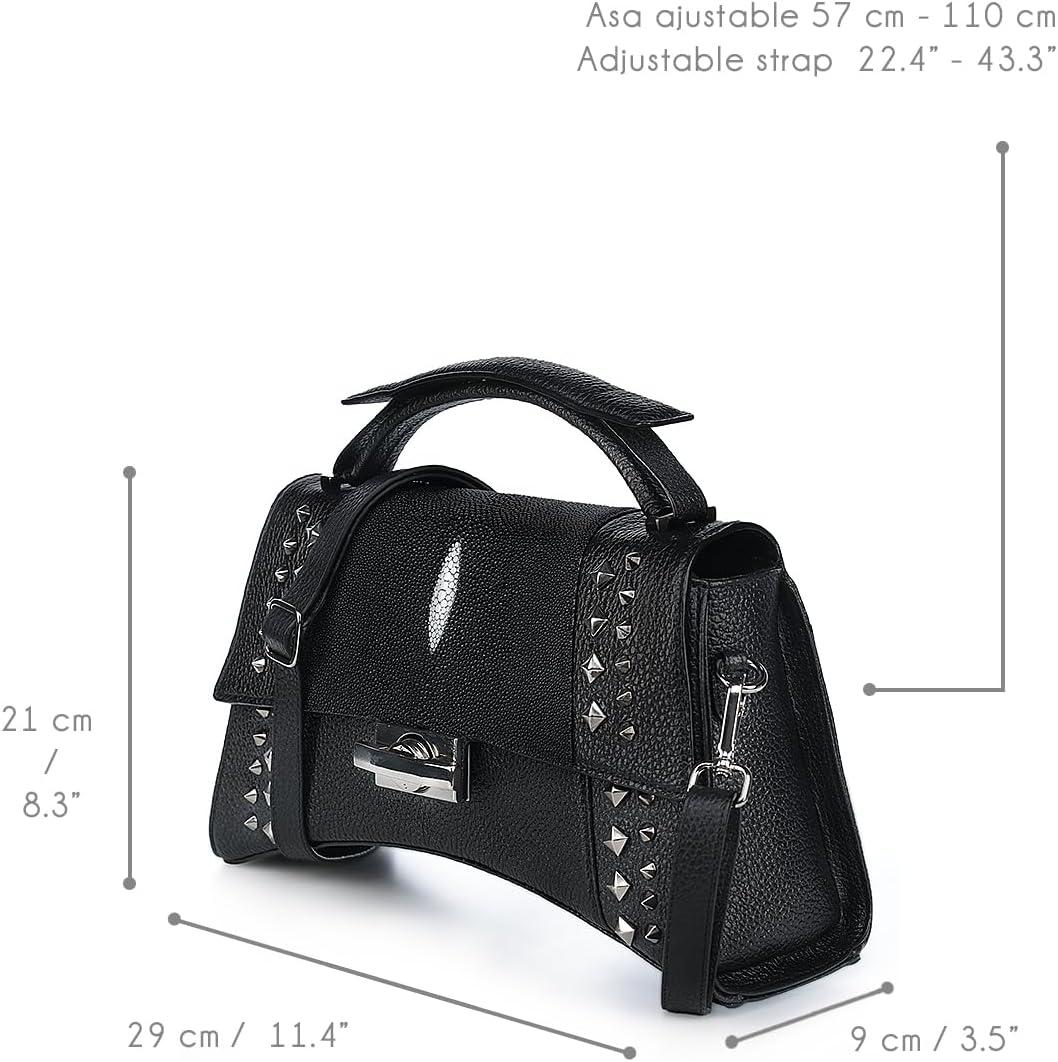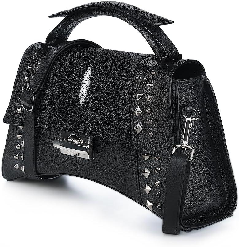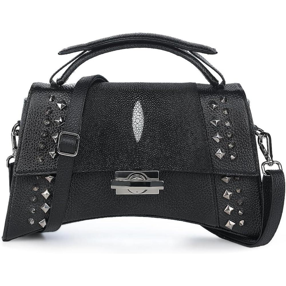 Hand bag for women, crafted from genuine stingray leather and bovine leather. The front is framed with metallic studs, creating a bold contrast against the unique texture of stingray. It features a front flap secured with a metal clasp and magnetic closures for added safety. Designed with functionality in mind, it includes a zippered inner pocket, a spacious compartment, and an external zip pocket for extra storage. Carry it by the short handle or use the adjustable, detachable strap for hands-free wear.