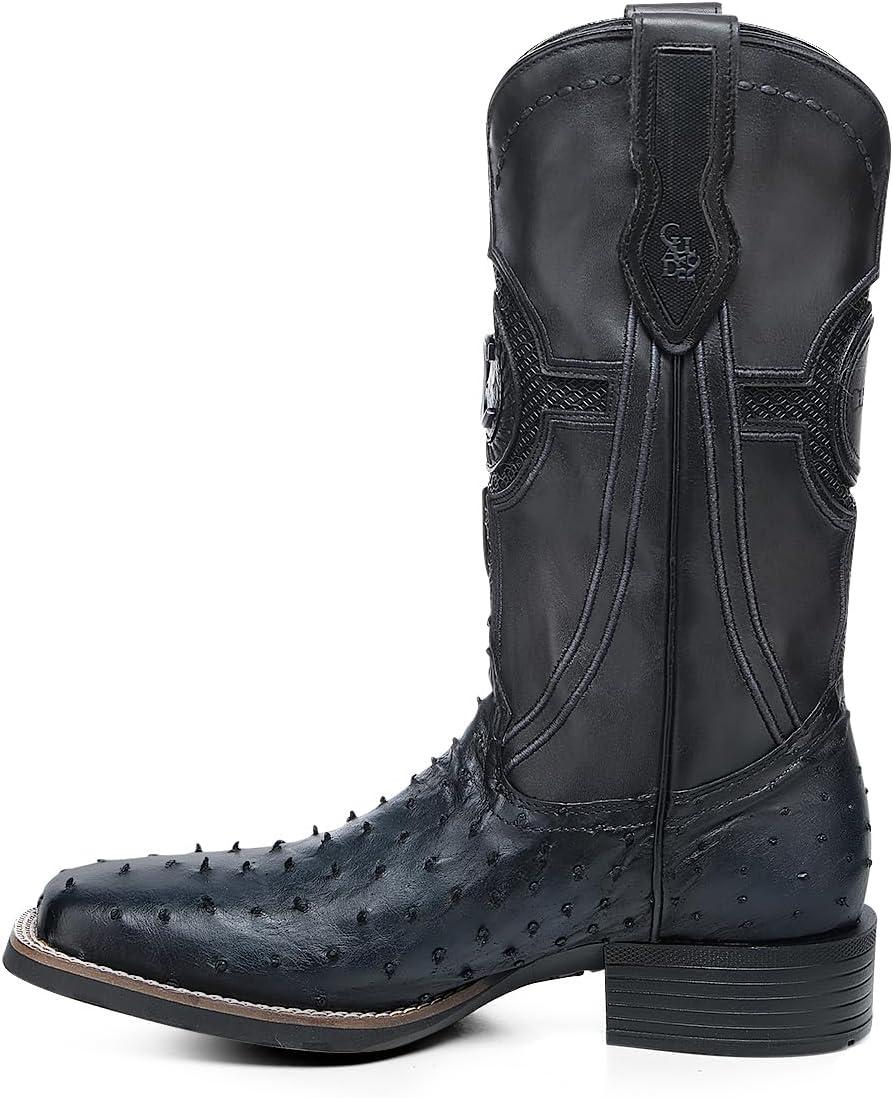 Step into luxury with these exquisite Western cowboy boots featuring genuine ostrich leather construction. The distinctive textured pattern of the ostrich leather on the vamp creates an eye-catching design that sets these boots apart. The classic square toe and traditional Western silhouette are enhanced by intricate stitching details and a decorative medallion accent on the shaft. The black leather upper extends into a tall shaft with pull straps for easy wear. A layered heel and durable outsole provide stable footing and classic Western styling. The boots showcase premium craftsmanship with precise stitching patterns and quality construction throughout. Perfect for both riding and casual wear, these boots combine timeless Western style with exotic leather luxury. The comfortable square toe design and sturdy construction make these boots ideal for long days in the saddle or a night out on the town. Each pair features subtle variations in the natural ostrich leather pattern, making them truly unique.