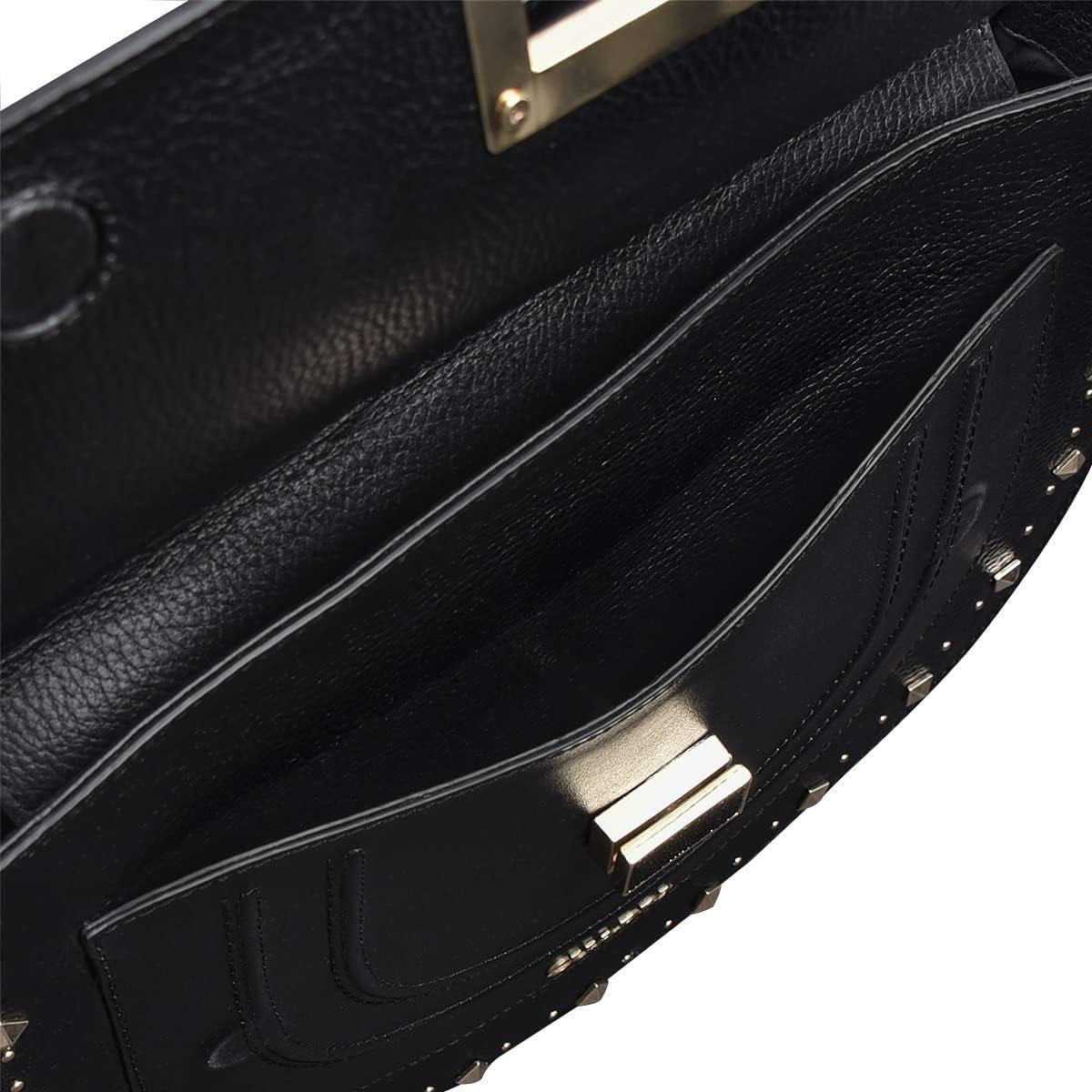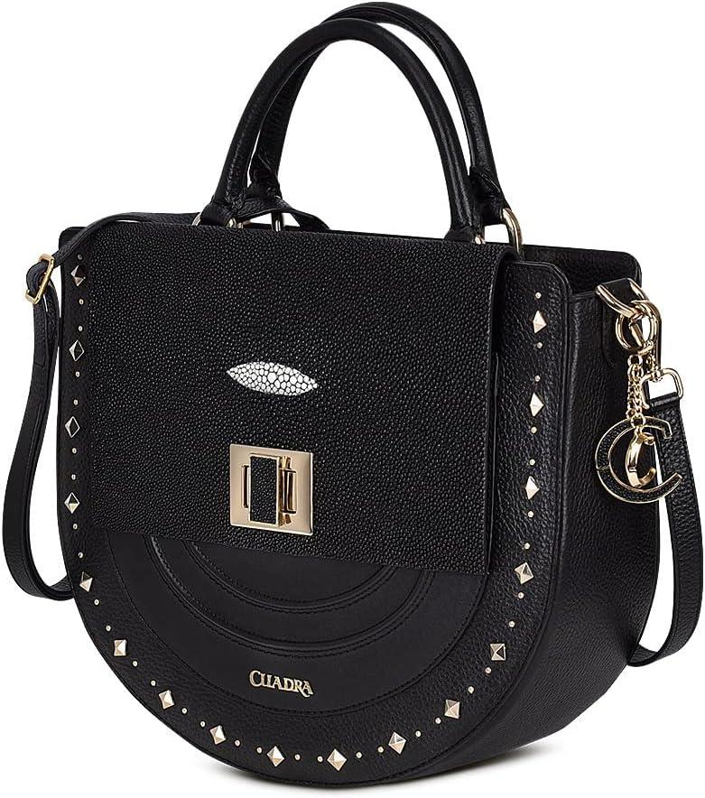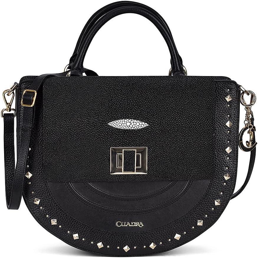 Make a statement with this satchel bag for women, crafted from genuine stingray leather, bovine leather, and nubuck side panels. The stingray leather is framed with handwoven leather detailing, highlighting the artisanal details behind the piece. Inside, you’ll find a dedicated compartment for cards or cash, while the back exterior includes a magnet-secured pocket for quick access. The short handle features hand-braided details and small stingray leather accents, and it also includes an adjustable, detachable long strap for crossbody wear. The front clasp adds a refined contrast with its two-tone finish, half gold, half black.