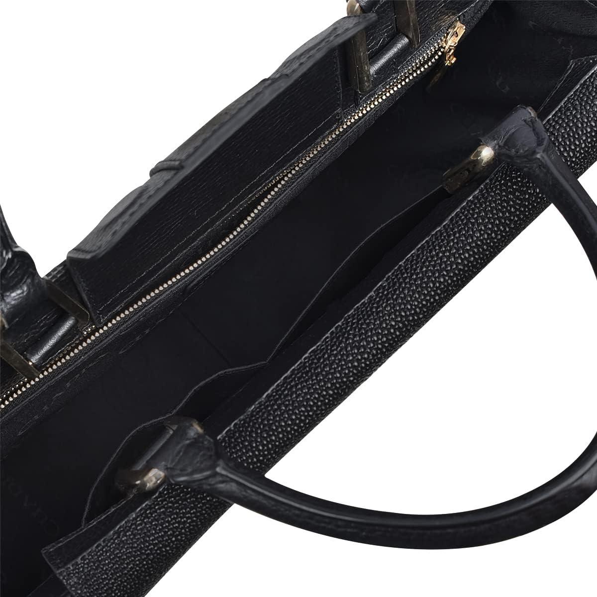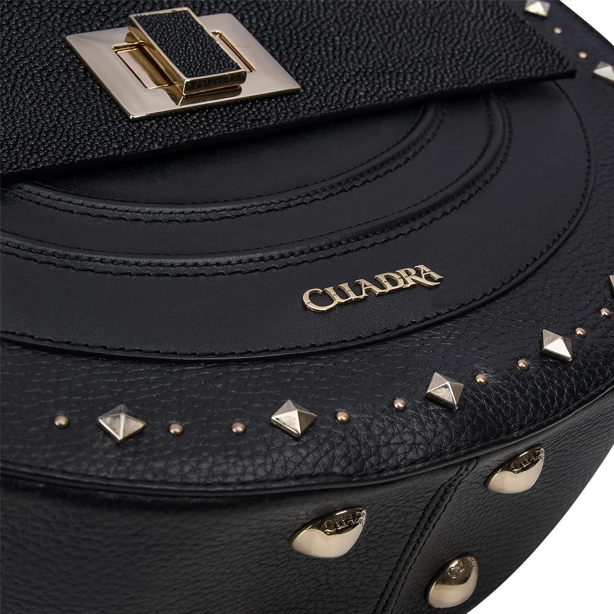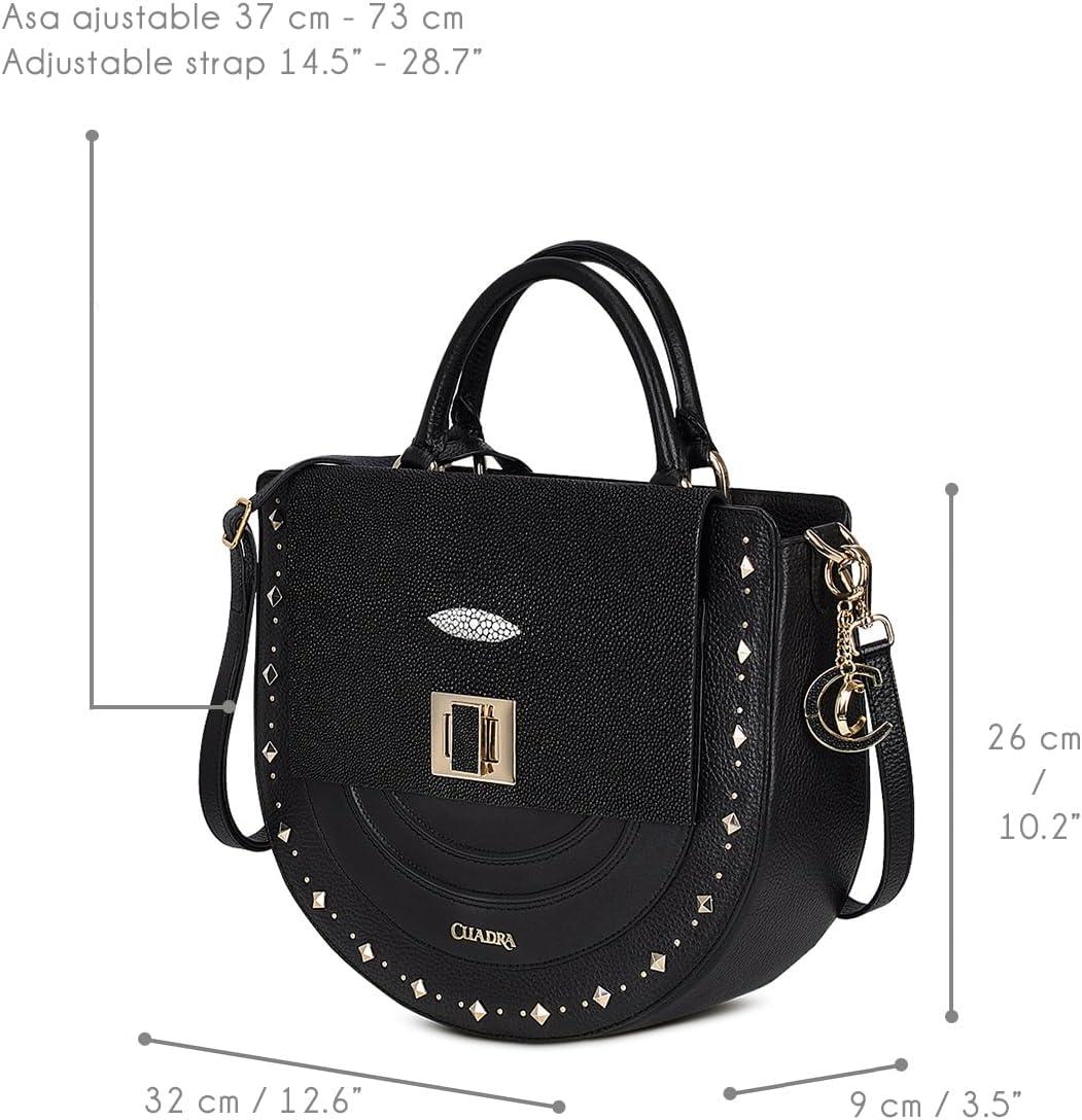 Elevate your style with this stunning Cuadra handbag for women, crafted in genuine stingray and bovine leather. Its unique semi-circular shape, metallic studs, and signature Cuadra logo on the front add bold personality to any outfit. Designed for both elegance and practicality, it features a front pocket, three interior compartments, one with a zipper and a flap accented with stingray leather. Includes short handles and a long adjustable strap so you can wear it your way.