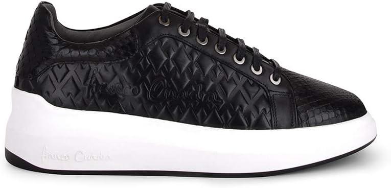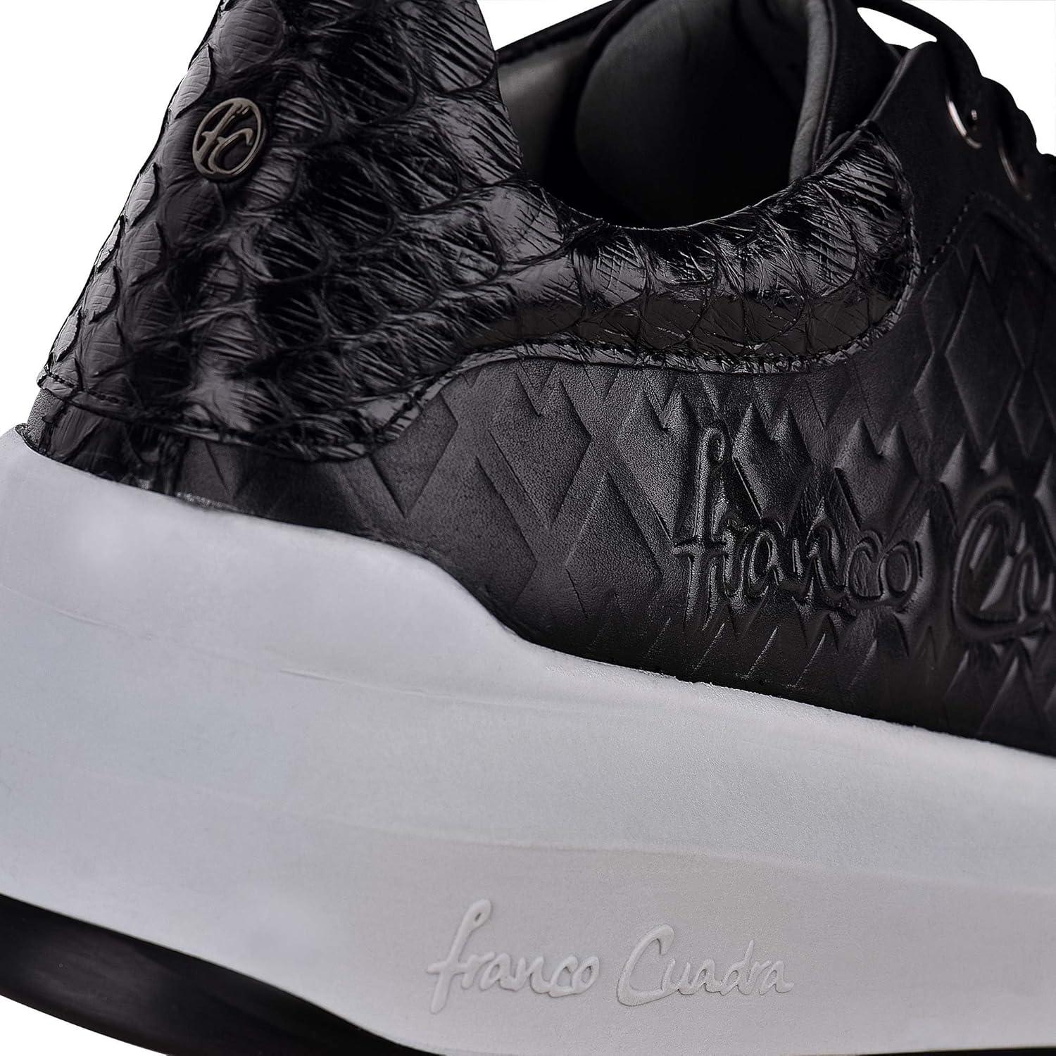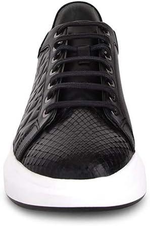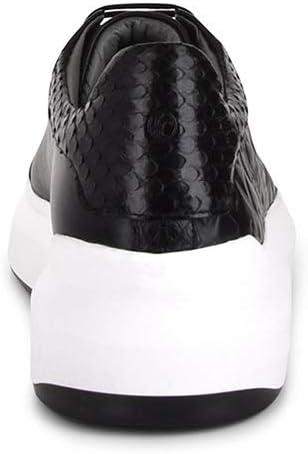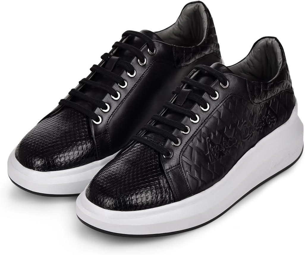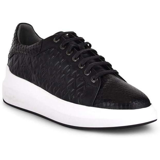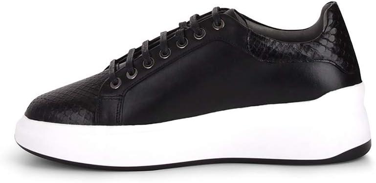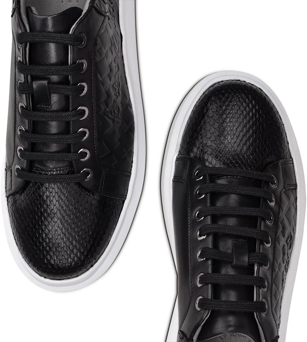 Step into sophisticated style with these striking black leather sneakers that blend luxury with everyday comfort. Featuring genuine python leather accents and a distinctive padded texture, these fashion-forward sneakers make a bold statement. The 2.12-inch platform sole crafted from lightweight TPU rubber provides excellent stability and flexibility while keeping you elevated in style. The classic lace-up design ensures a secure, adjustable fit, while the round toe and textile lining deliver all-day comfort. The bi-color sole isn't just about looks – it offers superior durability and heat resistance for lasting wear. Perfect for the modern woman who refuses to compromise between fashion and functionality, these sneakers seamlessly transition from casual outings to fashion-forward occasions. The expertly crafted combination of bovine and python leather creates an eye-catching texture that sets these sneakers apart, while the iconic logo details add a refined finishing touch. Whether paired with jeans or dresses, these versatile sneakers deliver both head-turning style and practical comfort for the fashion-conscious woman.