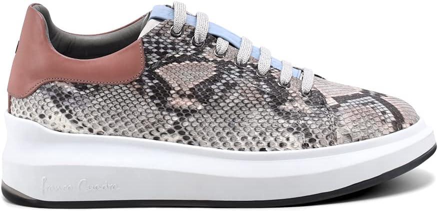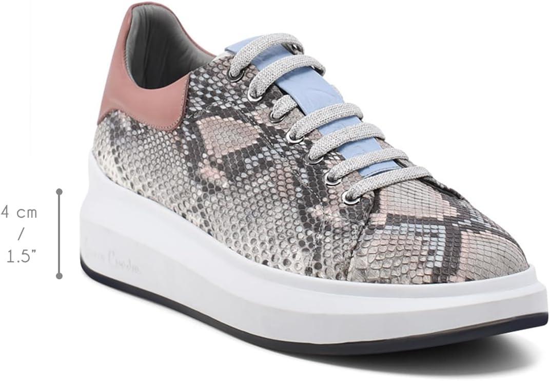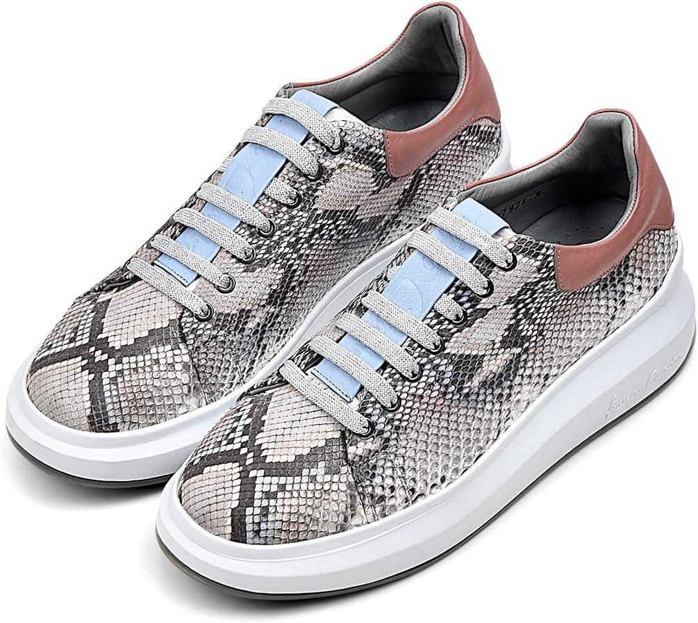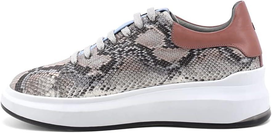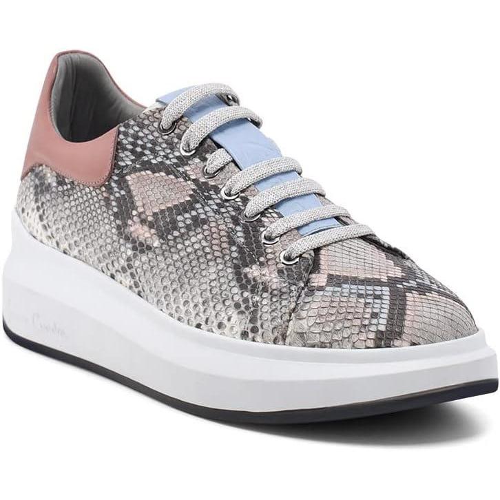 Step into sophisticated style with these stunning python leather sneakers. The exotic snakeskin pattern in elegant grey tones creates a luxurious statement piece, while the dusty rose heel counter adds a feminine touch. These fashion-forward sneakers feature a comfortable 2.12-inch platform sole crafted from lightweight EVA material, providing excellent cushioning for all-day wear. The classic lace-up design ensures a secure fit, while the round toe offers ample room for comfort. The textile lining and foam insole deliver superior comfort, making these perfect for casual outings. The versatile design seamlessly blends high-end luxury with everyday wearability. The durable rubber outsole provides reliable traction, while the platform design adds a modern edge to any outfit. These low-top sneakers are expertly crafted with a combination of genuine python leather and premium materials, showcasing exceptional attention to detail. Perfect for the fashion-conscious woman who refuses to compromise on style or comfort.