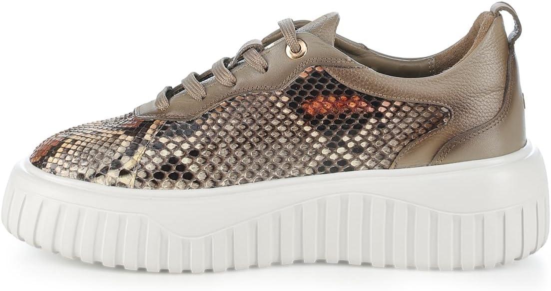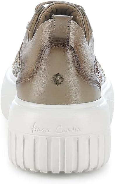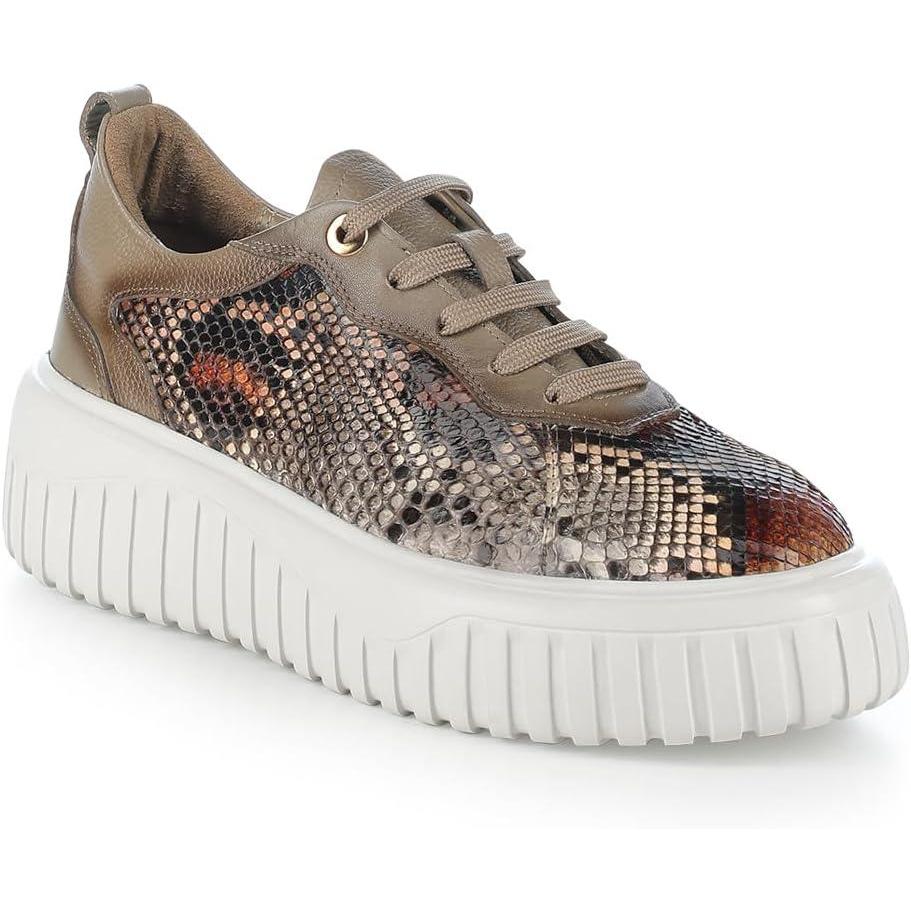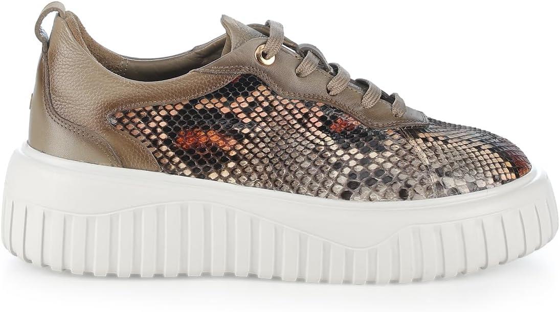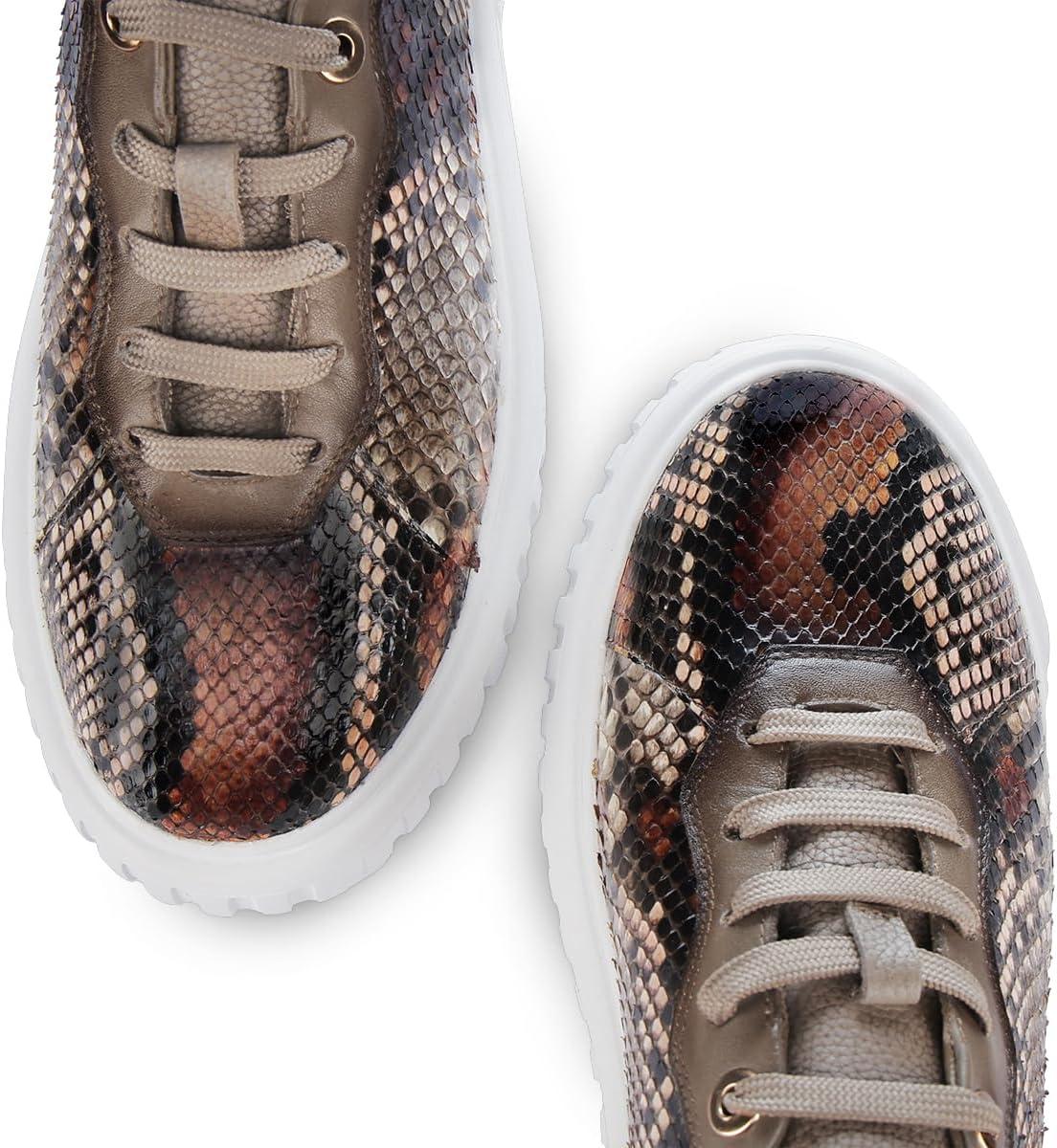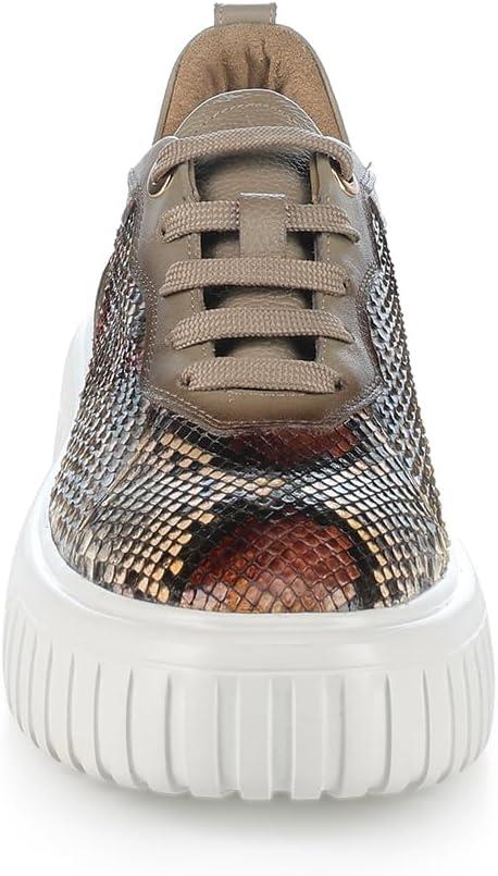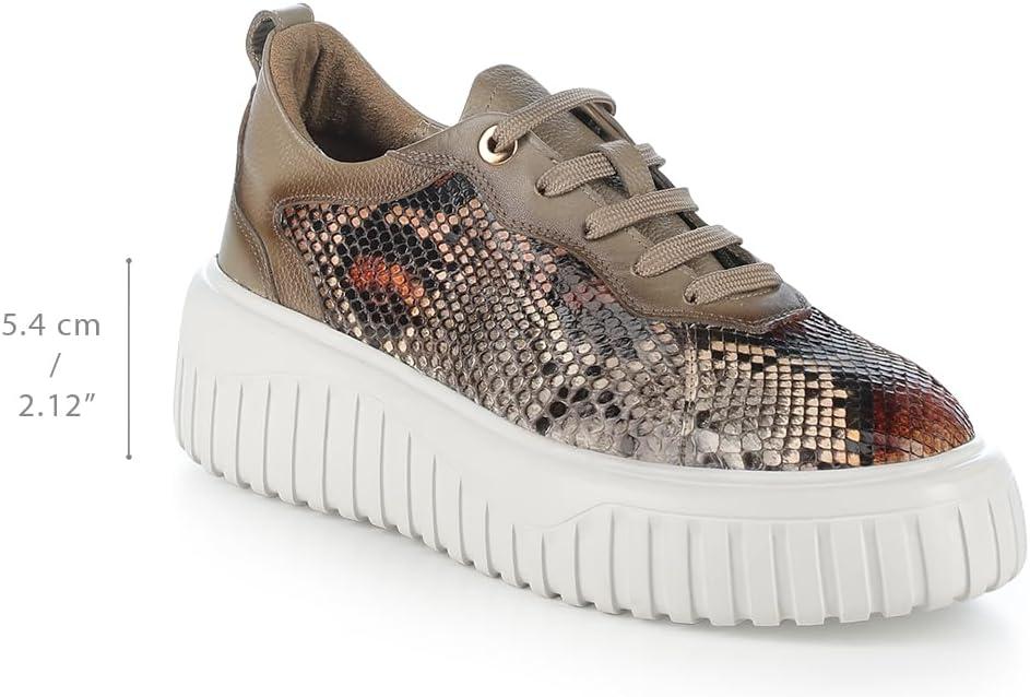 Elevate your style with these luxurious Franco Cuadra platform sneakers, masterfully crafted from genuine python leather with premium bovine leather accents. The striking snakeskin pattern in sophisticated beige and brown tones creates an eye-catching statement piece, while the chunky white platform sole adds a contemporary edge. Standing at 2.12 inches high, these sneakers combine bold fashion with practical comfort. The lace-up design features metallic eyelets and matching laces, ensuring a secure and adjustable fit. The platform's distinctive ridged design provides excellent traction while making a strong style statement. Perfect for fashion-forward individuals who appreciate unique textures and premium materials, these sneakers effortlessly blend exotic luxury with modern streetwear aesthetics. The combination of python leather and bovine details offers both durability and sophistication, making these shoes suitable for both casual outings and elevated everyday wear. To maintain their beauty, simply wipe with a soft, slightly damp cloth and polish in the direction of the scales.