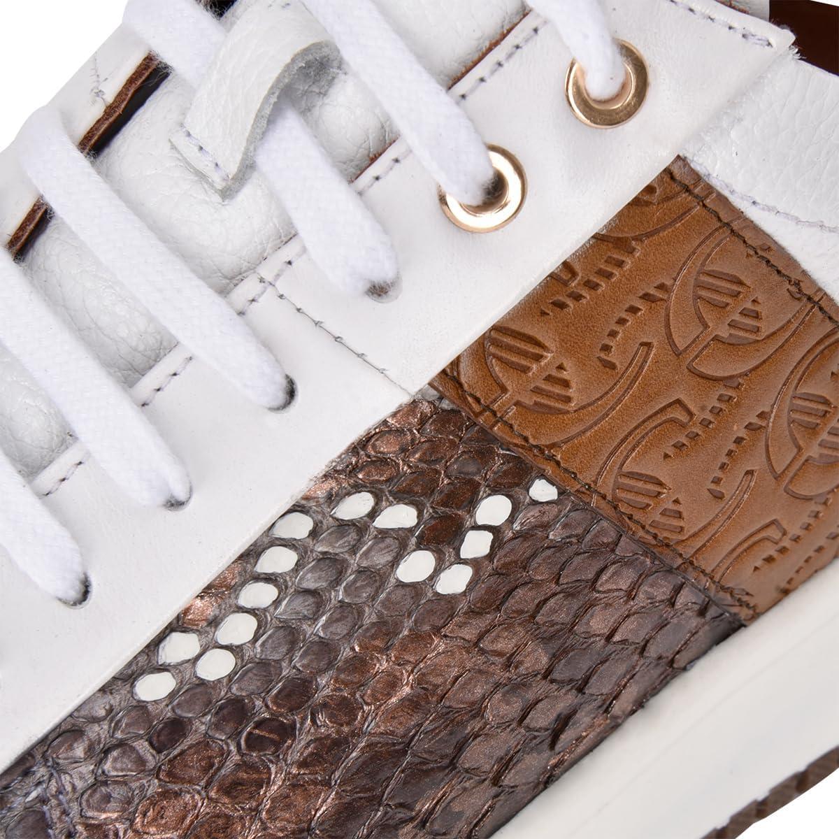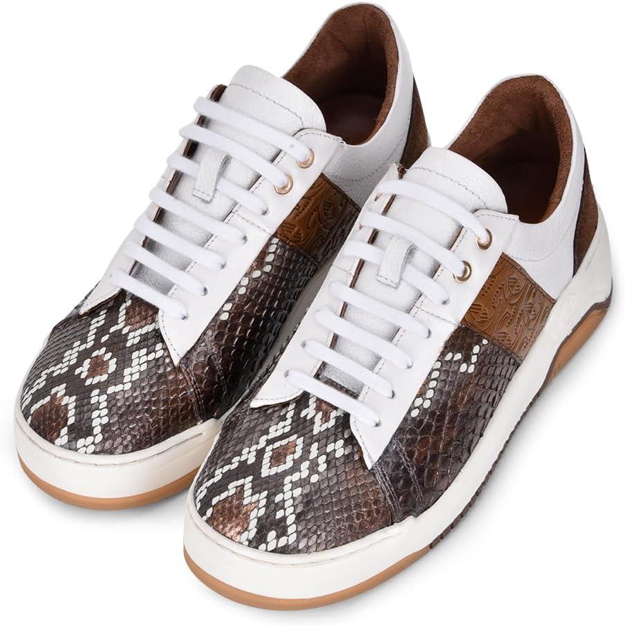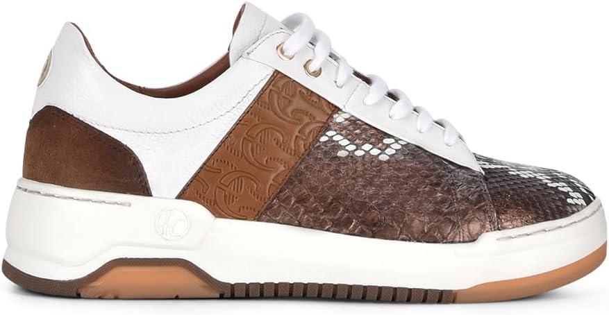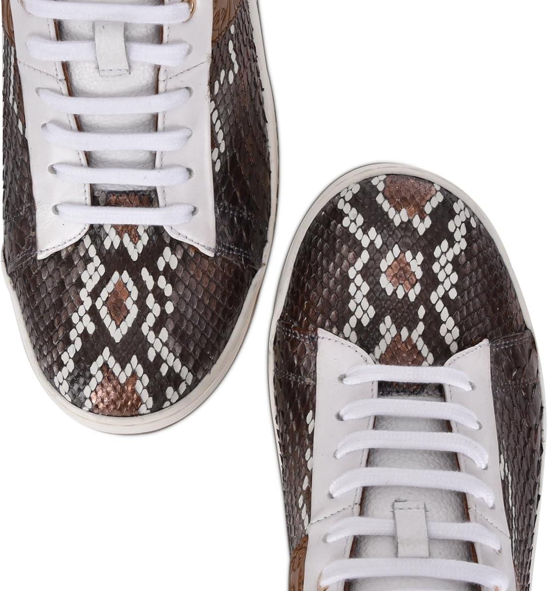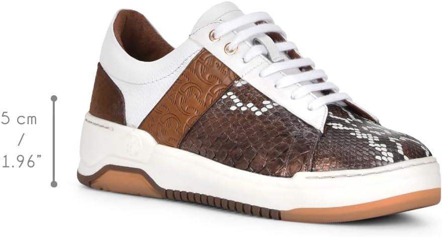 Step into sophisticated style with these luxurious women's sneakers featuring genuine python and bovine leather construction. The striking combination of white and brown creates an eye-catching design, while the distinctive snakeskin texture adds an exotic flair to any outfit. The classic low-top silhouette is enhanced with premium details, including monogrammed laces and a bi-tone rubber sole that provides both style and functionality. The 2.12-inch platform sole offers comfortable elevation while maintaining stability. These versatile sneakers feature a secure lace-up closure system and round toe design for all-day comfort. The foam insole provides cushioning support, while the textile lining ensures a comfortable fit. Perfect for casual occasions, these fashion-forward sneakers effortlessly blend luxury with practicality. The lightweight EVA sole delivers flexibility and durability, making these shoes ideal for everything from weekend outings to casual Fridays. Their modern aesthetic pairs beautifully with both dresses and denim, offering endless styling possibilities for the fashion-conscious woman.